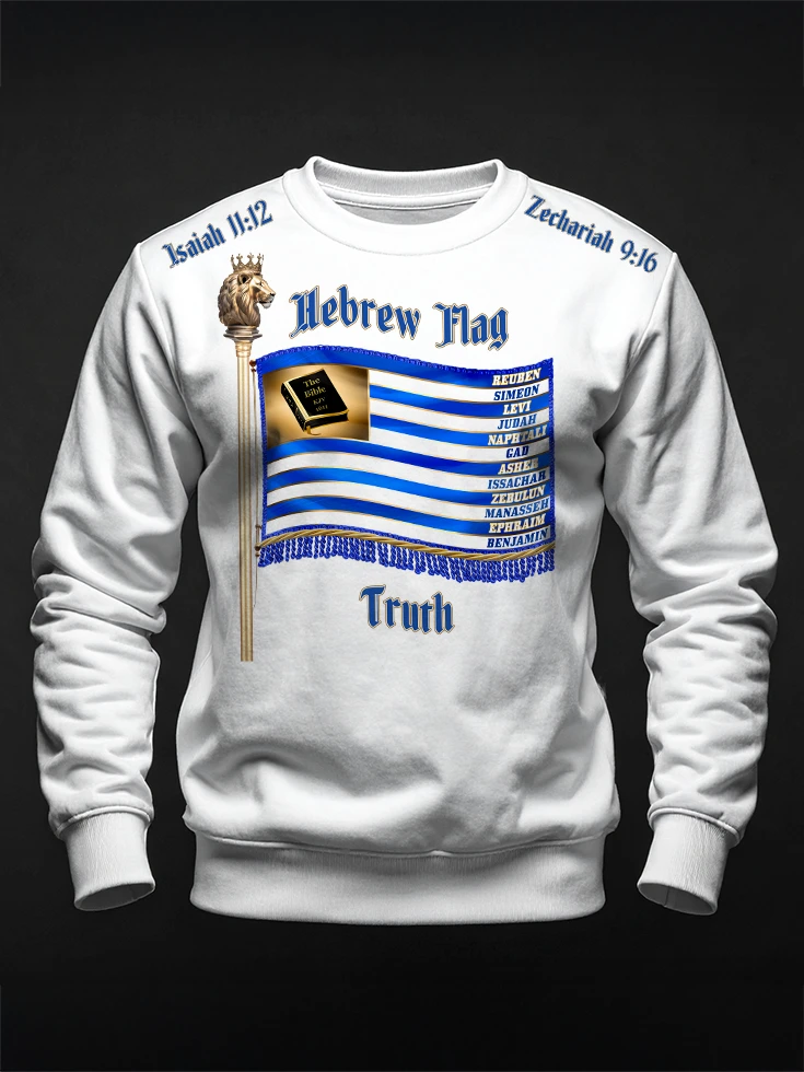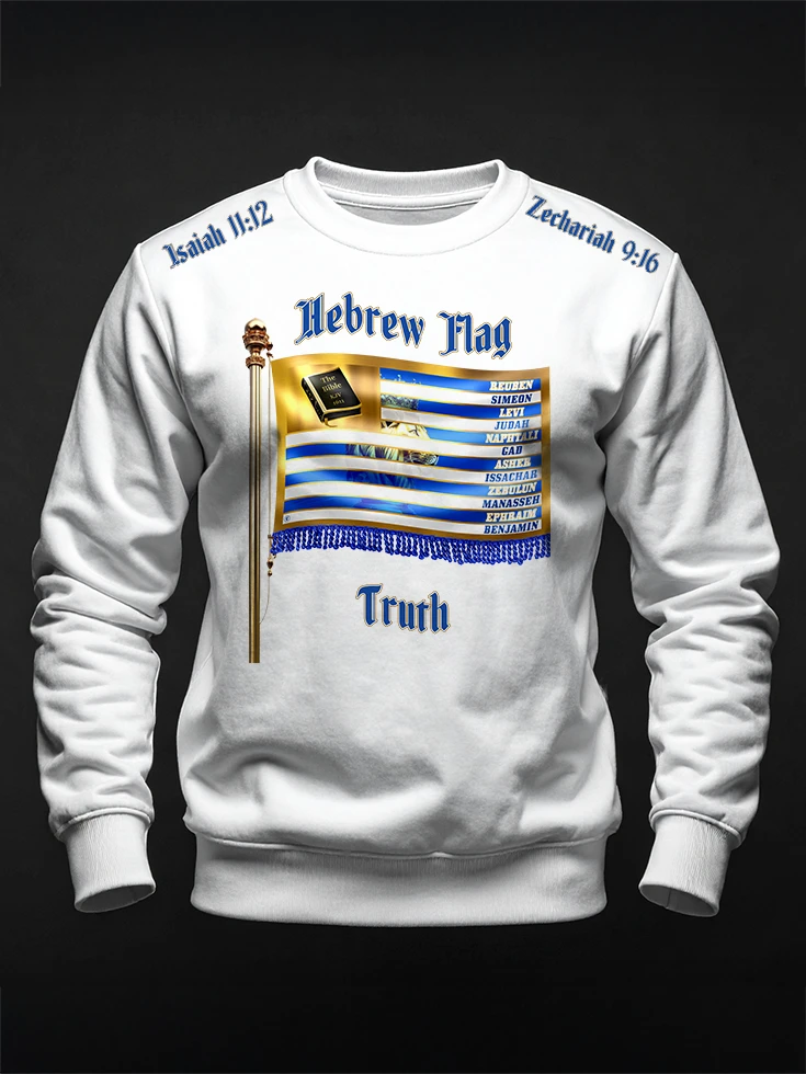 The front of the crewneck sweatshirt prominently displays the Hebrew flag along with depictions of the original 12 Tribes of Israel. Inspirational Bible scriptures from Isaiah 11:12 and Zechariah 9:16 enhance the garment’s spiritual significance.