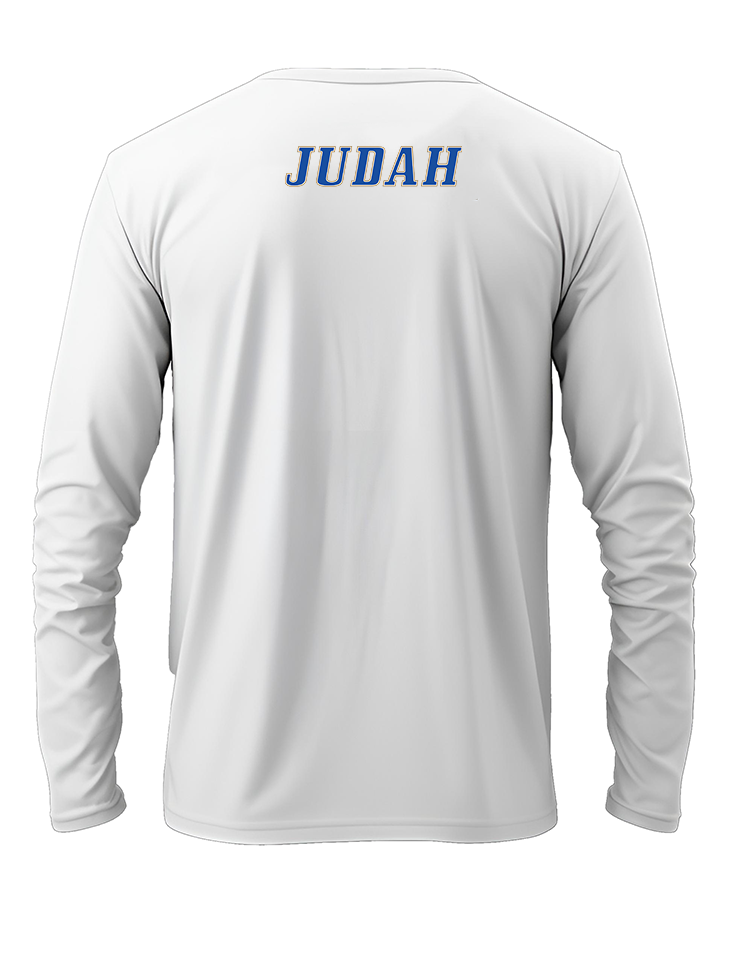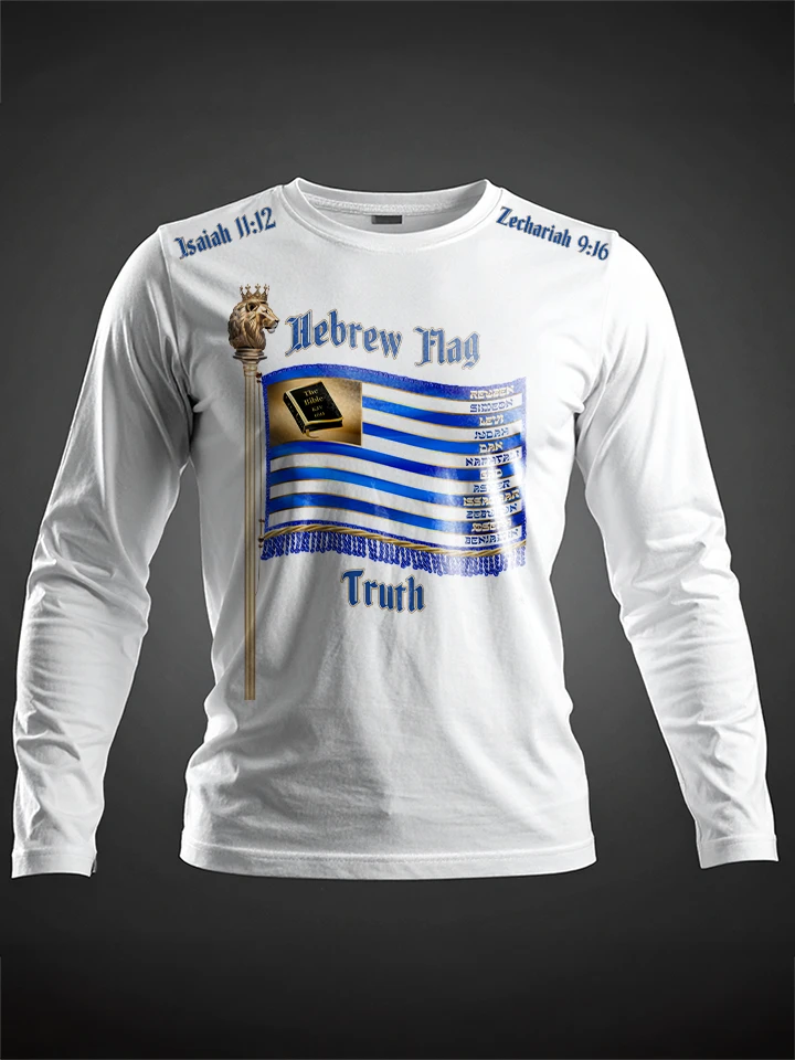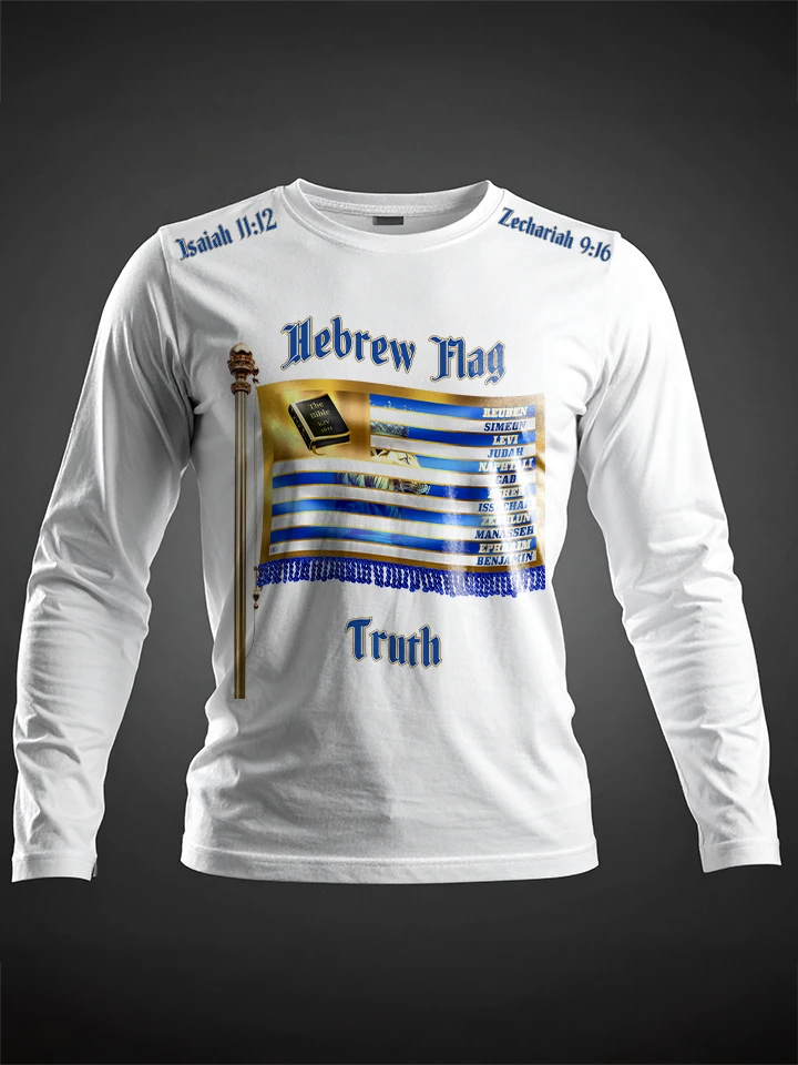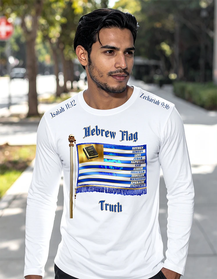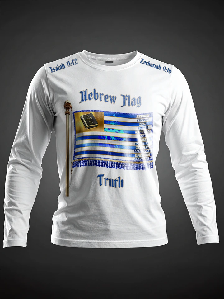 The front of the long-sleeve t-shirt prominently displays the Hebrew flag, along with depictions of the original 12 Tribes of Israel. Inspirational Bible scriptures from Isaiah 11:12 and Zechariah 9:16 enhance the garment’s spiritual significance.